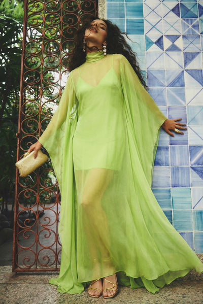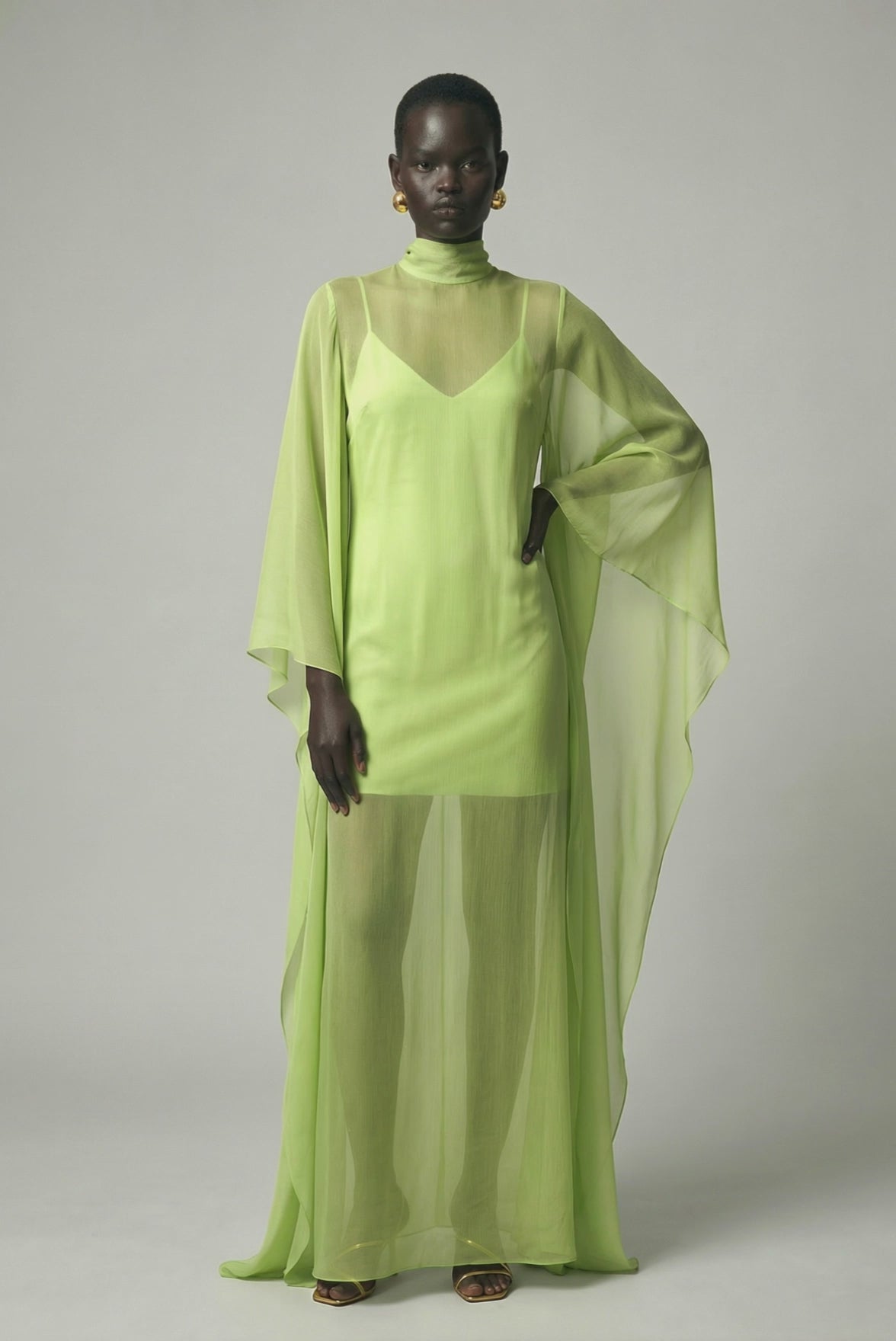 Vestido estilo capa de gasa verde lima transparente con cuello alto
