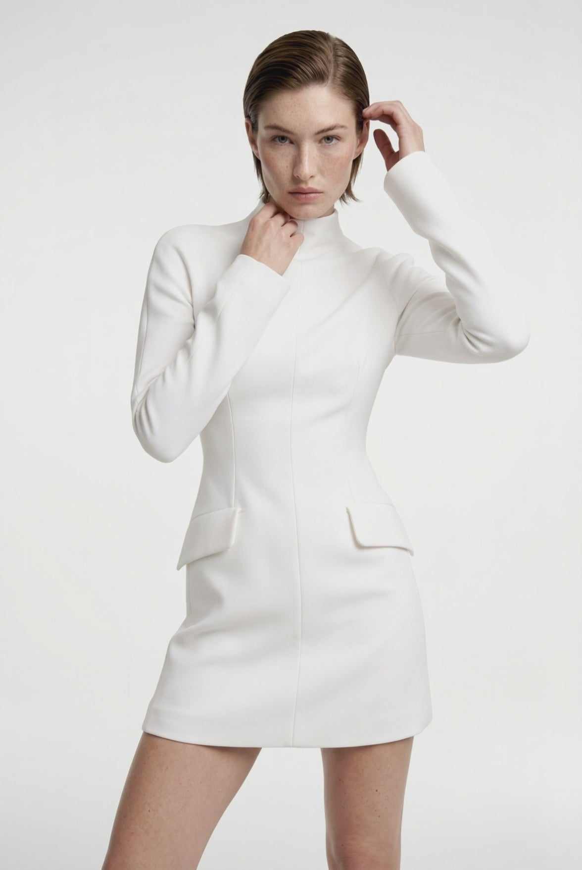 A high neckline creates visual balance and definition, offering a controlled contrast between softness and structure. Designed to follow the form with confidence, this piece reflects a sense of confidence and sophistication.